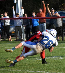 Peru's Kasen Brennan (26) carries the defender into the endzone for the winning score with under two minutes left in the game. It would be a classic match this time though in the playoffs as the #2 Beekmantown Eagles would host the #3 Peru Indians in the Class B Semmi-Finals. Peru would get the first score of the game at 8:58 of the first quarter on a 30 yard fumble recovery to make it 7-0. The Indians would extend the lead to 14-0 in the first few seconds of the second quarter on a 7 yard pass to Alex Rine. The Beekmantown Wagles would cut the lead in half on a 38 yard run by Cristobal Arzola to make it 14-7 at 1:58 of the second quarter. Then at the 5:06 mark of the second quarter the Eagles would tie the game at 14 on a 20 yard run by Dylan Hazel. The game would stay there til the 4th quarter when the Beekmantown Eagles would take the 21-14 lead on a 25 yard quarterback keeper from Brandon Belrose. The Indians would march right back down and score on a 10 yard pass to Robert Reynolds although they would miss the extra point to make it 21-20 with 8 minutes left. Then from that point on the game would get very questionable as there was alot of very questionable calls that would go against Beekmantown. With that going on the Indians would get the eventual game winning score with 1:50 left in the game on Kasen Brennan 12 yard run for the 26-21 victory. In the winning effort the Peru Indians go to 2-6 and have a date with the Plattsburgh Hornets for the Class B Championships and the Beekmantown Eagles season comes to a end at 4-4. Gallery.