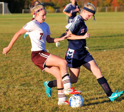 Chateaugay's Katie Beach (7) with the toe drag takes around Parishville-Hopkinton's Kayla Myers (6) and goes to the net. It would be a battle of the top 20 teams as the Chateaugay Bulldogs would host the Parishville-Hopkinton Panthers in the home finale of the season. The Chateaugay Bulldogs would take the quick 1-0 lead on Danielle Charland's goal in the 3rd minute. The Bulldogs extend there lead to 2-0 in the 8th minute on an own goal. The Bulldogs would make it 3-0 when Katie Beach would score in the 15th minute. Then in the 55th minute Hannah Cook scored to make it 4-0. The Bulldogs would end there scoring in the 70th minute on Courtney Yando's goal to secure the 5-0 win. In the winning effort Kennedy Boyea would stop five for the shutout as the Bulldogs go to 12-0-1. Gallery