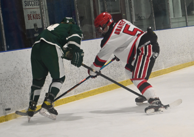 Saranac's Landon Giroux (17) with the hit along the end boards that knocks the puck loose and pins Rice's Tyler Russo along the boards. Gallery